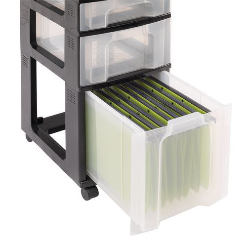 - Plastový stojan s vysouvacími boxy pro uložení dokumentů a různých předmětů.