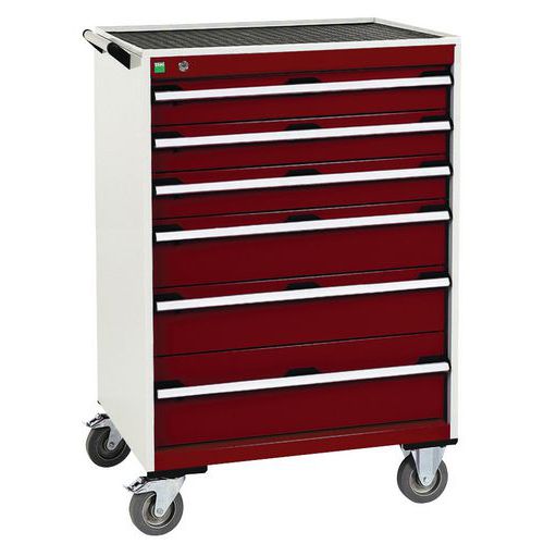 Mobilní zásuvkové skříně Bott Cubio s horní pracovní plochou tloušťky 2 cm typu multiplex/linoleum nebo ohraněný plech s rohoží. Nosnost až 600 kg, robustní svařovaná ocelová konstrukce, povrchová úprava práškovým lakem. Centrálně uzamykatelné zásuvky s výškou 3 x 10, 2 x 15 a 1 x 20 cm, nosností 50 kg a 100% výsuvem na válečkových ložiskách. Ergonomické rukojeti zásuvek s popisovatelnou lištou, systém blokace otevření více zásuvek najednou. Dvě pevná a dvě otočná kola s brzdou o průměru 12,5 cm. Max. zatížení (kg) : 600 kg