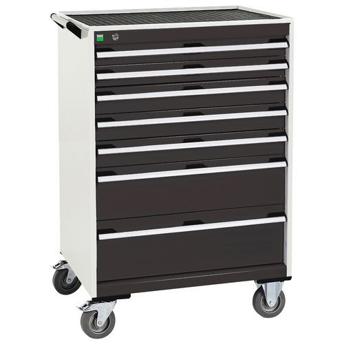 Mobilní zásuvkové skříně Bott Cubio s horní pracovní plochou tloušťky 2 cm typu multiplex/linoleum nebo ohraněný plech s rohoží. Nosnost až 600 kg, robustní svařovaná ocelová konstrukce, povrchová úprava práškovým lakem. Centrálně uzamykatelné zásuvky s výškou 2 x 7,5 cm, 3 x 10, 1 x 15 a 1 x 20 cm, nosností 50 kg a 100% výsuvem na válečkových ložiskách. Ergonomické rukojeti zásuvek s popisovatelnou lištou, systém blokace otevření více zásuvek najednou. Dvě pevná a dvě otočná kola s brzdou o průměru 12,5 cm. Max. zatížení (kg) : 600 kg