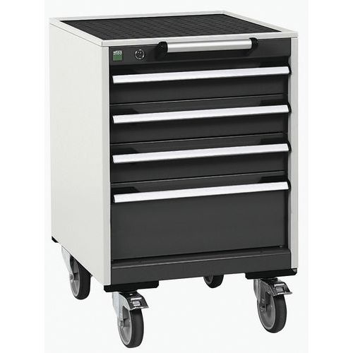 Mobilní zásuvkové skříně Bott Cubio s horní pracovní plochou tloušťky 2 cm typu multiplex/linoleum nebo ohraněný plech s rohoží. Nosnost až 300 kg, robustní svařovaná ocelová konstrukce, povrchová úprava práškovým lakem. Centrálně uzamykatelné zásuvky s výškou 3 x 10 a 1 x 20 cm, nosností 50 kg a 100% výsuvem na válečkových ložiskách. Ergonomické rukojeti zásuvek s popisovatelnou lištou, systém blokace otevření více zásuvek najednou. Dvě pevná a dvě otočná kola s brzdou o průměru 12,5 cm. Max. zatížení (kg) : 300 kg