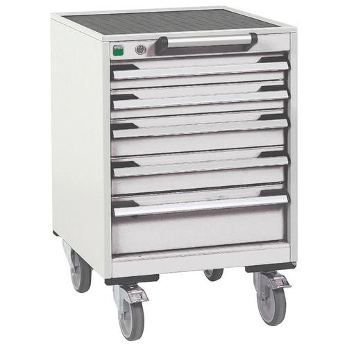 Mobilní zásuvkové skříně Bott Cubio s horní pracovní plochou tloušťky 2 cm typu multiplex/linoleum nebo ohraněný plech s rohoží. Nosnost až 300 kg, robustní svařovaná ocelová konstrukce, povrchová úprava práškovým lakem. Centrálně uzamykatelné zásuvky s výškou 2 x 7,5 cm, 2 x 10 a 1 x 15 cm, nosností 50 kg a 100% výsuvem na válečkových ložiskách. Ergonomické rukojeti zásuvek s popisovatelnou lištou, systém blokace otevření více zásuvek najednou. Dvě pevná a dvě otočná kola s brzdou o průměru 12,5 cm.