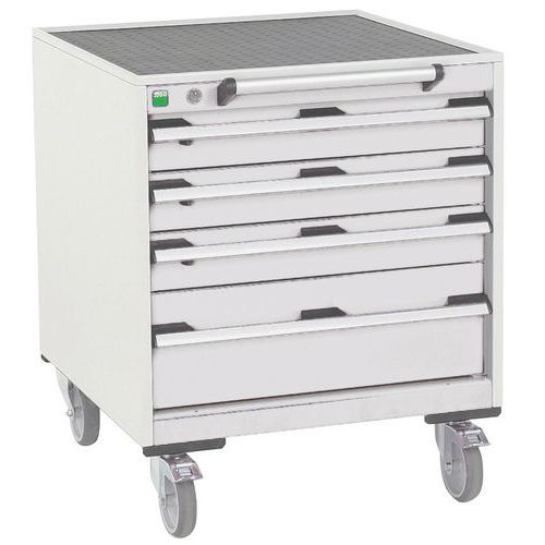 Mobilní zásuvkové skříně Bott Cubio s horní pracovní plochou tloušťky 2 cm typu multiplex/linoleum nebo ohraněný plech s rohoží. Nosnost až 300 kg, robustní svařovaná ocelová konstrukce, povrchová úprava práškovým lakem. Centrálně uzamykatelné zásuvky s výškou 3 x 10 a 1 x 20 cm, nosností 50 kg a 100% výsuvem na válečkových ložiskách. Ergonomické rukojeti zásuvek s popisovatelnou lištou, systém blokace otevření více zásuvek najednou. Dvě pevná a dvě otočná kola s brzdou o průměru 12,5 cm. Max. zatížení (kg) : 300 kg