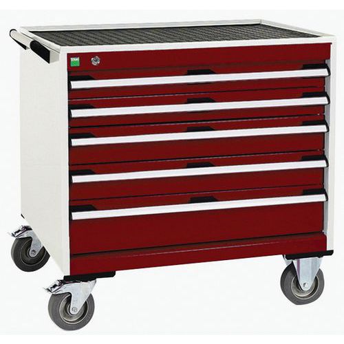 Mobilní zásuvkové skříně Bott Cubio s horní pracovní plochou tloušťky 2 cm typu multiplex/linoleum nebo ohraněný plech s rohoží. Nosnost až 600 kg, robustní svařovaná ocelová konstrukce, povrchová úprava práškovým lakem. Centrálně uzamykatelné zásuvky s výškou 2 x 7,5 cm, 2 x 10 a 2 x 15 cm, nosností 50 kg a 100% výsuvem na válečkových ložiskách. Ergonomické rukojeti zásuvek s popisovatelnou lištou, systém blokace otevření více zásuvek najednou. Dvě pevná a dvě otočná kola s brzdou o průměru 12,5 cm. Max. zatížení (kg) : 600 kg