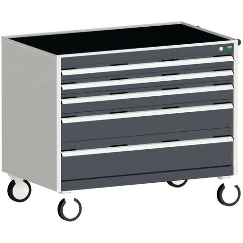 Mobilní zásuvkové skříně Bott Cubio s horní pracovní plochou tloušťky 2 cm typu multiplex/linoleum nebo ohraněný plech s rohoží. Nosnost až 600 kg, robustní svařovaná ocelová konstrukce, povrchová úprava práškovým lakem. Centrálně uzamykatelné zásuvky s výškou 2 x 7,5 cm, 1 x 10, 1 x 15 a 1 x 20 cm, nosností 50 kg a 100% výsuvem na válečkových ložiskách. Ergonomické rukojeti zásuvek s popisovatelnou lištou, systém blokace otevření více zásuvek najednou. Dvě pevná a dvě otočná kola s brzdou o průměru 12,5 cm.