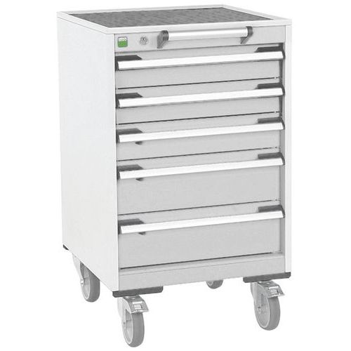 Mobilní zásuvkové skříně Bott Cubio s horní pracovní plochou tloušťky 2 cm typu multiplex/linoleum nebo ohraněný plech s rohoží. Nosnost až 300 kg, robustní svařovaná ocelová konstrukce, povrchová úprava práškovým lakem. Centrálně uzamykatelné zásuvky s výškou 3 x 10 a 2 x 15 cm, nosností 50 kg a 100% výsuvem na válečkových ložiskách. Ergonomické rukojeti zásuvek s popisovatelnou lištou, systém blokace otevření více zásuvek najednou. Dvě pevná a dvě otočná kola s brzdou o průměru 12,5 cm. Max. zatížení (kg) : 300 kg