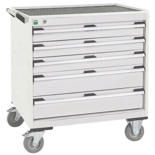 Mobilní zásuvkové skříně Bott Cubio s horní pracovní plochou tloušťky 2 cm typu multiplex/linoleum nebo ohraněný plech s rohoží. Nosnost až 600 kg, robustní svařovaná ocelová konstrukce, povrchová úprava práškovým lakem. Centrálně uzamykatelné zásuvky s výškou 3 x 10 a 2 x 15 cm, nosností 50 kg a 100% výsuvem na válečkových ložiskách. Ergonomické rukojeti zásuvek s popisovatelnou lištou, systém blokace otevření více zásuvek najednou. Dvě pevná a dvě otočná kola s brzdou o průměru 12,5 cm. Max. zatížení (kg) : 600 kg