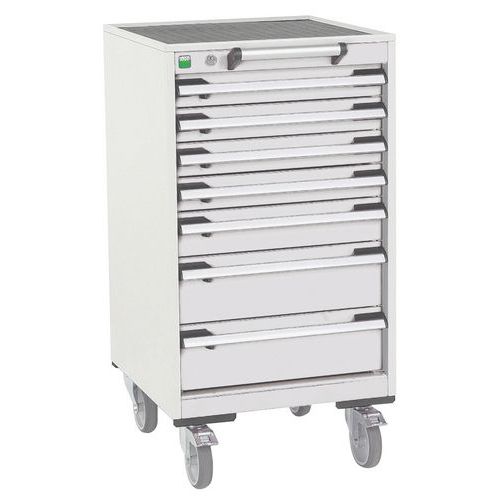 Mobilní zásuvkové skříně Bott Cubio s horní pracovní plochou tloušťky 2 cm typu multiplex/linoleum nebo ohraněný plech s rohoží. Nosnost až 300 kg, robustní svařovaná ocelová konstrukce, povrchová úprava práškovým lakem. Centrálně uzamykatelné zásuvky s výškou 4 x 7,5, 1 x 10 a 2 x 15 cm, nosností 50 kg a 100% výsuvem na válečkových ložiskách. Ergonomické rukojeti zásuvek s popisovatelnou lištou, systém blokace otevření více zásuvek najednou. Dvě pevná a dvě otočná kola s brzdou o průměru 12,5 cm. Max. zatížení (kg) : 300 kg