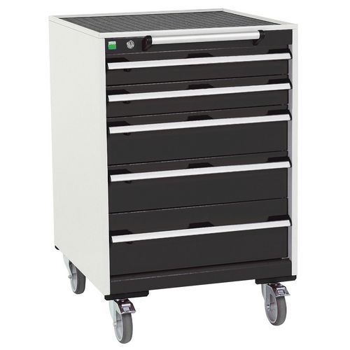Mobilní zásuvkové skříně Bott Cubio s horní pracovní plochou tloušťky 2 cm typu multiplex/linoleum nebo ohraněný plech s rohoží. Nosnost až 300 kg, robustní svařovaná ocelová konstrukce, povrchová úprava práškovým lakem. Centrálně uzamykatelné zásuvky s výškou 2 x 10, 2 x 15 a 1 x 20 cm, nosností 50 kg a 100% výsuvem na válečkových ložiskách. Ergonomické rukojeti zásuvek s popisovatelnou lištou, systém blokace otevření více zásuvek najednou. Dvě pevná a dvě otočná kola s brzdou o průměru 12,5 cm. Max. zatížení (kg) : 300 kg