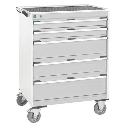 Mobilní zásuvkové skříně Bott Cubio s horní pracovní plochou tloušťky 2 cm typu multiplex/linoleum nebo ohraněný plech s rohoží. Nosnost až 600 kg, robustní svařovaná ocelová konstrukce, povrchová úprava práškovým lakem. Centrálně uzamykatelné zásuvky s výškou 2 x 10, 2 x 15 a 1 x 20 cm, nosností 50 kg a 100% výsuvem na válečkových ložiskách. Ergonomické rukojeti zásuvek s popisovatelnou lištou, systém blokace otevření více zásuvek najednou. Dvě pevná a dvě otočná kola s brzdou o průměru 12,5 cm. Max. zatížení (kg) : 600 kg