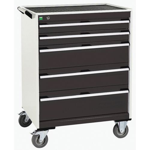 Mobilní zásuvkové skříně Bott Cubio s horní pracovní plochou tloušťky 2 cm typu multiplex/linoleum nebo ohraněný plech s rohoží. Nosnost až 600 kg, robustní svařovaná ocelová konstrukce, povrchová úprava práškovým lakem. Centrálně uzamykatelné zásuvky s výškou 2 x 10, 2 x 15 a 1 x 20 cm, nosností 50 kg a 100% výsuvem na válečkových ložiskách. Ergonomické rukojeti zásuvek s popisovatelnou lištou, systém blokace otevření více zásuvek najednou. Dvě pevná a dvě otočná kola s brzdou o průměru 12,5 cm. Max. zatížení (kg) : 600 kg