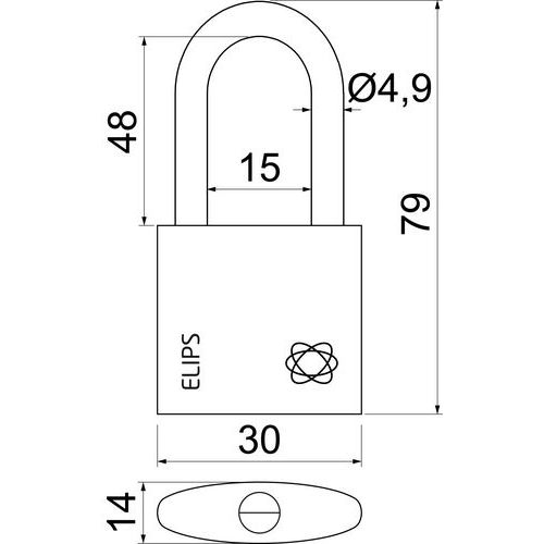 Mosazný visací zámek s kartáčovaným povrchem, průměr třmene 4,9 mm, výška 48 mm, mosaz
