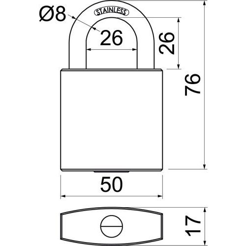 Nerezový visací zámek s jemně kartáčovaným povrchem, průměr třmene 8 mm, výška 26 mm