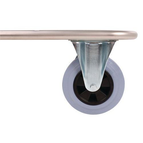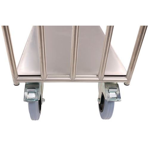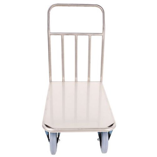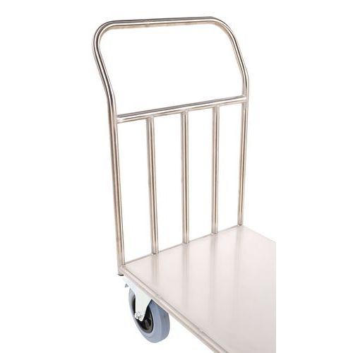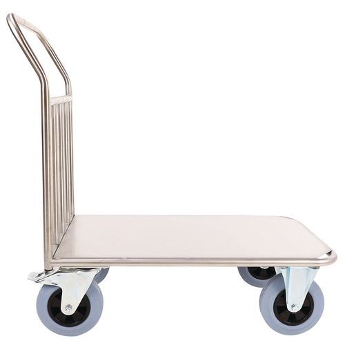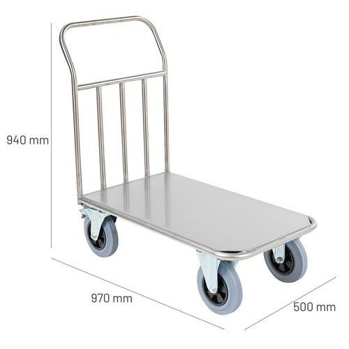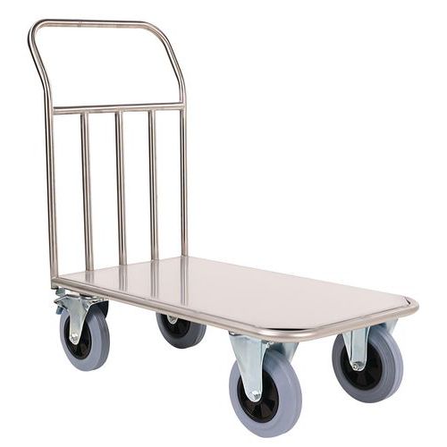 Nerezová přepravní plošina určená pro manipulaci s produkty v kuchyních. Ložná nerezová plocha, madlo vyrobené z nerezových profilů o průměru 25 mm. Mobilitu zajišťují otočná kola o průměru 20 cm, z nichž dvě jsou opatřená brzdou z pozinkované chromované oceli.