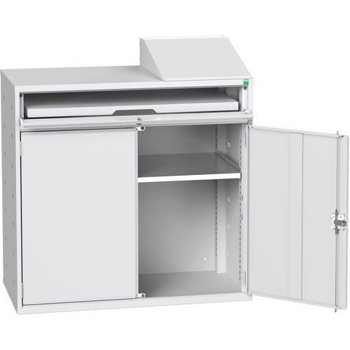 - Obsahuje jednu pozinkovanou výškově přestavitelnou polici s nosností 75 kg a průchod pro kabely a šikmý psací pult.