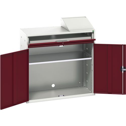 - Obsahuje jednu pozinkovanou výškově přestavitelnou polici s nosností 75 kg a průchod pro kabely a šikmý psací pult.