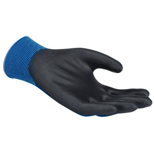 Polomáčené rukavice v polyuretanu vhodné pro lehkou práci v suchém až mírně mastném prostředí.