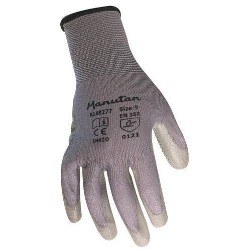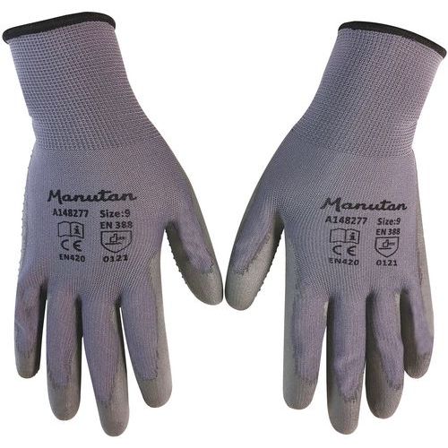 Nylonové rukavice Manutan Expert s terčíky polomáčené v polyuretanu, šedé, vel. 9