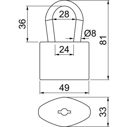 Ocelový visací zámek jednoduché lamelové konstrukce,průměr třmene 6 mm, výška 36 mm, SU1