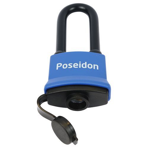 Ocelový visací voděodolný zámek s plastovým krytem s prodloženým třmenem, průměr třmene 7 mm, výška 52 mm,