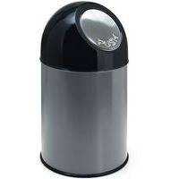 - Koš na odpadky s otevíráním pomocí tlačítka. Kovové tělo a plastové víko. Tlačný ventil je vyroben z nerezové oceli.