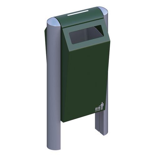 Robustní a odolná proti vandalismu. Tento odpadkový koš lze upevnit mezi hliníkové upevňovací sloupky zasazené do země.