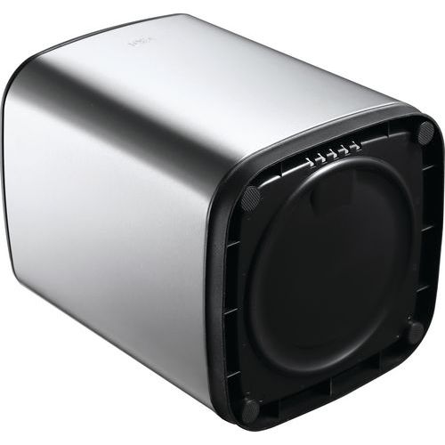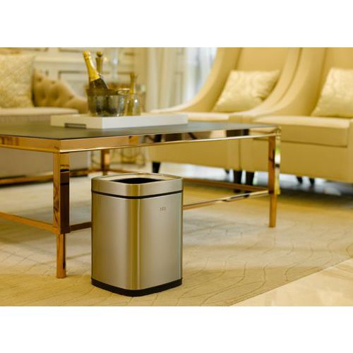 - Čtvercový koš z matné nerezové oceli s horním otvorem.