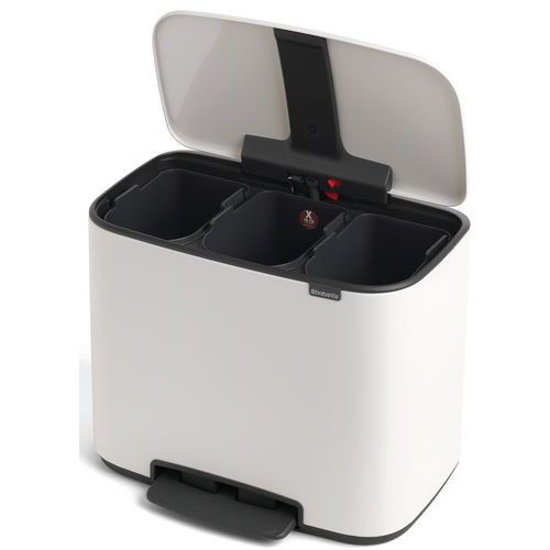 - Pedálový odpadkový koš s tichým zavíráním víka, lehkým nožním pedálem a vložkami 3 x 11 l pro třídění odpadu.
