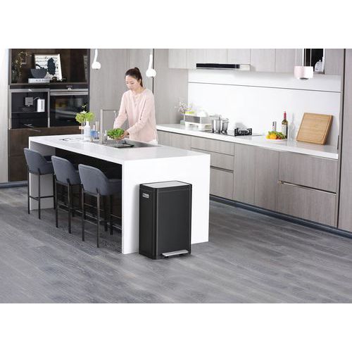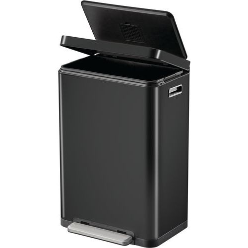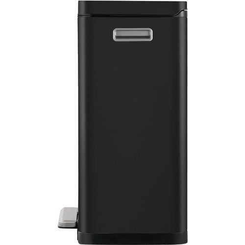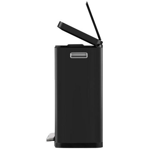 - Elegantní obdélníkový odpadkový koš s extra širokým nášlapným pedálem, plastovou vložkou, tichým zavíráním víka a funkcí stay-open.