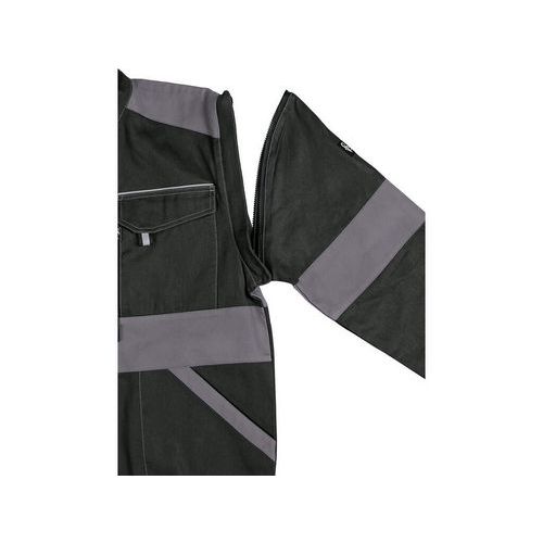 Černá pánská montérková blůza s šedými doplňky. Náprsní a přední kapsy schovají telefon, metr a další drobné předměty potřebné k práci. Praktické nošení zajišťuje stahovací guma v pase a rukávy zakončené pružnou manžetou. Odepnutím rukávů lze blůzu během chvilky proměnit ve vestu. Kryté zapínání na zip a zapínání u krku. EN ISO 13688: Tato mezinárodní norma určuje obecné požadavky na provedení ochranných oděvů z hlediska ergonomie, nezávadnosti, označení velikostí, stárnutí, kompatibility a značení ochranných oděvů a na informace, které jsou dodávány výrobcem s ochrannými oděvy. CE