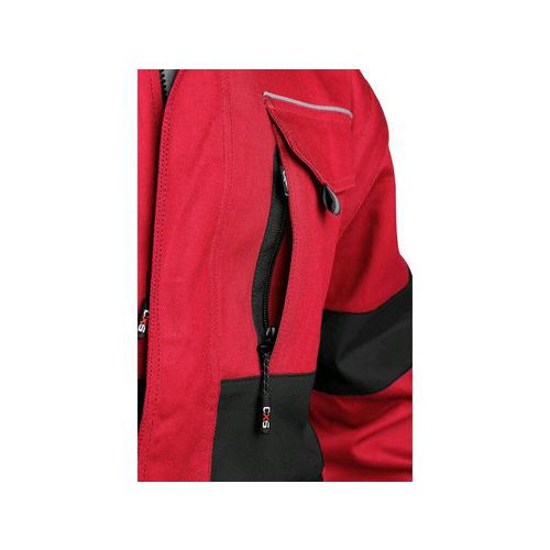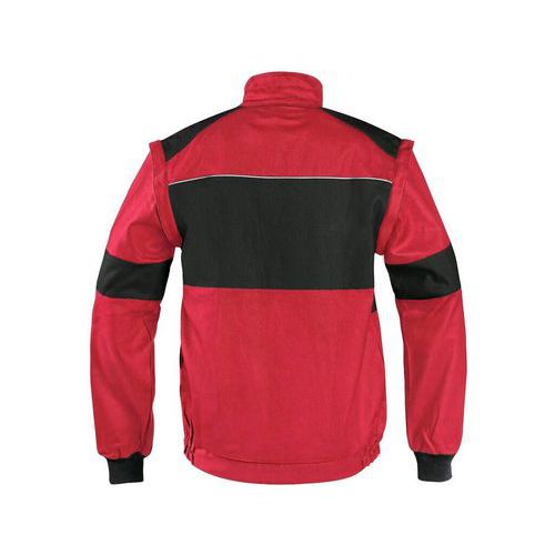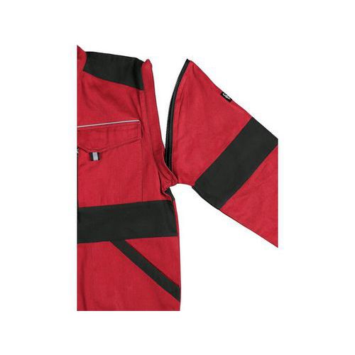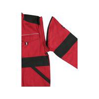 Červená pánská montérková blůza s černými doplňky. Náprsní a přední kapsy schovají telefon, metr a další drobné předměty potřebné k práci. Praktické nošení zajišťuje stahovací guma v pase a rukávy zakončené pružnou manžetou. Odepnutím rukávů lze blůzu během chvilky proměnit ve vestu. Kryté zapínání na zip a zapínání u krku. EN ISO 13688: Tato mezinárodní norma určuje obecné požadavky na provedení ochranných oděvů z hlediska ergonomie, nezávadnosti, označení velikostí, stárnutí, kompatibility a značení ochranných oděvů a na informace, které jsou dodávány výrobcem s ochrannými oděvy.
