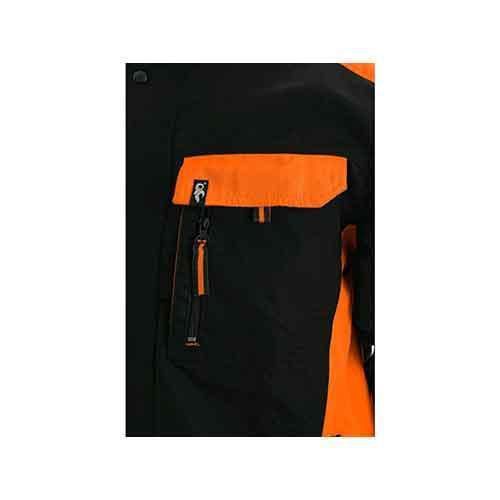 Černo-oranžová pánské montérková blůza s reflexními doplňky. Velké náprsní kapsy s menší kapsičkou na telefon, kapsičkou na zip a praktickým poutkem s plastovým očkem schovají různé předměty potřebné k práci. Zapínání bočních kapes na zip zabrání nechtěnému vypadnutí předmětů z kapsy. Rukávy zakončené nastavitelnou manžetou. Kryté zapínání ke krku na zip a druky. Materiál polyester 65%, bavlna 35% Norma EN ISO 13688 definuje všeobecné požadavky na provedení ochranných oděvů z hlediska ergonomie, nezávadnosti, označení velikostí, stárnutí, kompatibility a značení ochranných oděvů a na informace, které jsou dodávány výrobcem s ochrannými oděvy.
