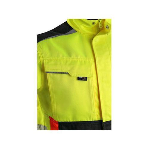 Žlutočerná výstražná montérková blůza s oranžovými doplňky. Relfexní pruhy jsou tvořeny z malých reflexních segmentů. Zesílená ramena materiálem CORDURA. Levá náprsní kapsa na zip, pravá kapsa krytá klopu, boční kapsy na zip, levý rukáv s kapsičkou na tužky. Kryté zapnínání na zip a rukávy do manžety se zapínáním na suchý zip. Vhodné pro stavebnictví, silničáře, údržbu, logistiku, leteckou a lodní dopravu. EN ISO 20471: Tato mezinárodní norma určuje požadavky na oděv s vysokou viditelností, který je schopen vizuálně signalizovat přítomnost uživatele. Oděv s vysokou viditelností má poskytovat uživateli viditelnost pro obsluhu vozidel nebo jiných mechanizovaných prostředků za jakýchkoliv světelných podmínek při denním světle a při osvětlení světlomety za tmy. Není použitelná pro situace se středním a nízkým rizikem. Obsahuje kvalitativní požadavky jak na barvu a retroreflexi, tak na minimální plochy a umístění materiálů na ochranném oděvu.