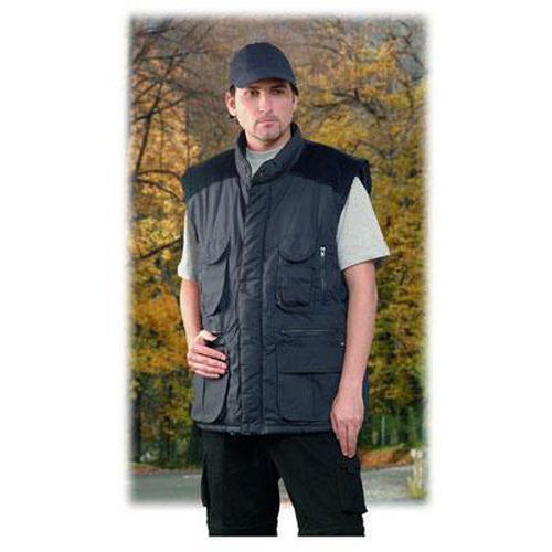 - Černá zateplená pracovní vesta s rameny a límcem prošité manšestrem. Vesta má 14 kapes, z toho tři vnitřní. Možnost stažení vesty v pase.