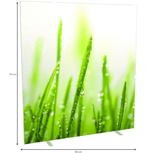 Plátěný panel v různých barevných provedeních pro oddělení prostoru. Plátno je ohnivzdorné v kategorii M1 a lze jej prát na 30 °. Vybavený dvěma stabilními nožkami z bílé lakované oceli. Rychlá a snadná montáž plátna. Záruka výrobce pro zákazníka : 10 let