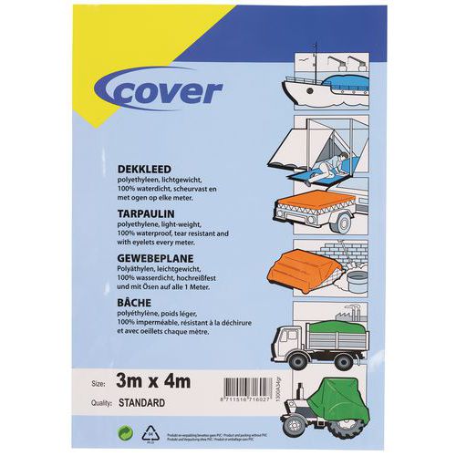- Vysoce odolná krycí PET plachta s nerezavějícími oky. Oboustranně potažená, odolná vůči chemikáliím a tukům, vodě, otěru, kyselinám a plísním.