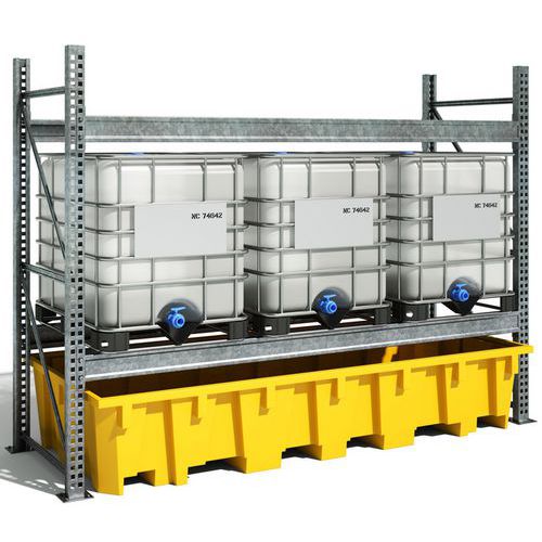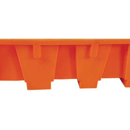Plastové záchytné vany se záchytnou kapacitou až 1 650 l. Vhodné pro skladování 2 IBC nádrží. Vyrobené z polyetylenu, nekorodují a jsou odolné vůči chemikáliím. S vanou lze manipulovat pomocí vysokozdvižného vozíku. Nabízeno ve variantě bez roštu, s plastovým roštem nebo s galvanizovaným ocelovým roštem. Záruka výrobce pro zákazníka : 10 let