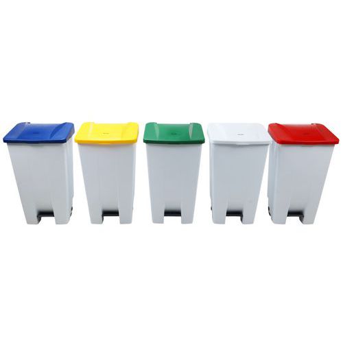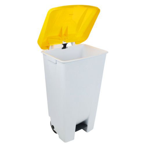 Plastové odpadkové koše s barevnými víky vhodné do potravinářských prostorů. Koše jsou opatřené dvěma kolečky a madlem na zadní straně. Hygienické otevírání víka nášlapným systémem na přední straně koše.