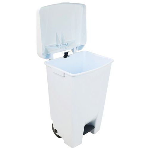 Plastové odpadkové koše s barevnými víky vhodné do potravinářských prostorů. Koše jsou opatřené dvěma kolečky a madlem na zadní straně. Hygienické otevírání víka nášlapným systémem na přední straně koše.