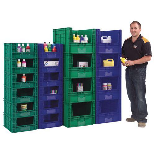 - Plastové přepravky s velkým otvorem na přední straně jsou dodávány v modré a zelené barvě.