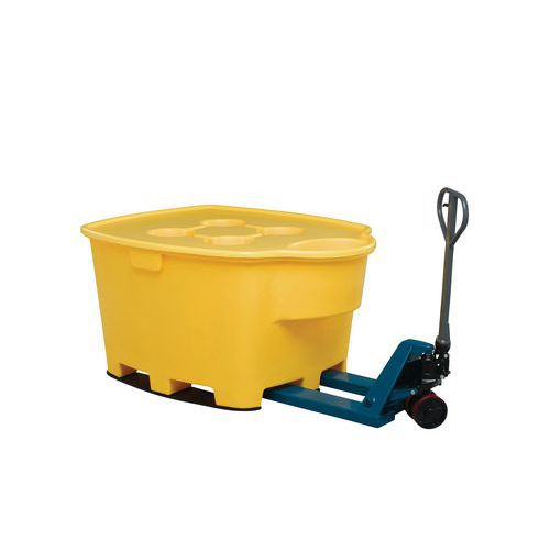Varianta pro jeden IBC kontejner je vybavená protiskluzovými lištami pro snadnou manipulaci s paletovým vozíkem a proti nechtěnému pohybu vany při uložení na paletě.
