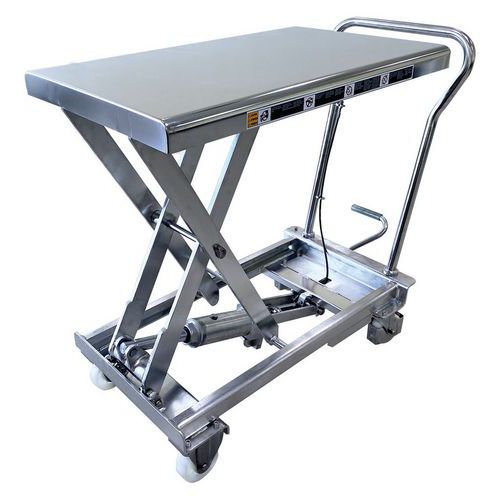 - Zvedací stůl z nerezové oceli, ideální pro farmaceutický, chemický a potravinářský průmysl, nemocnice a restaurace.