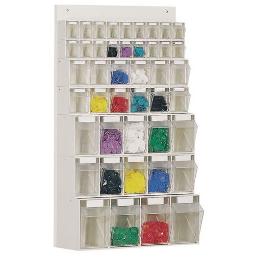 Výklopné přihrádky: 2 x 9 zásobníků a 2 x 6 zásobníků. Velikost zásobníku, řada po 9 kusech: 66 x 51 x 77 mm Velikost zásobníku, řada po 6 kusech: 1 x 75 x 113 mm Výrobek je dodáván s etiketami.