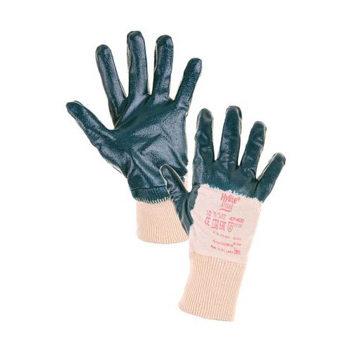 Rukavice s dlaněmi a prsty povrstvenými nitrilem, úpletová manžeta. Délka rukavice: 27 cm. Doporučené použití: dodávky plynu a elektřiny, příjem a odbavování zboží, lisování. Odvětví: automobilový, strojní a stavební průmysl, logistika. Velikost: 8, 9, 10 Piktogramy: 1 / 3111, 9, 10 Normy: EN 388, EN 420 Materiálové složení: smyčková bavlna Délka: 27cm Norma EN 420
