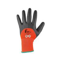 Rukavice s dlanemi a prsty povrstvenými do 3/4 v nitrilu s prodyšnou úpravou a s PVC tercíky. Doporucené použití: práce ve vlhkém nebo lehce zaolejovaném prostredí. Odvětví: stavebnictví, automobilový prumysl, lehký prumysl, skladová manipulace. Velikost: 8” - 10” Normy: EN 388 (4121), EN 420 Materiálové složení: 100 % polyester Barva: oranžovo-šedá Norma EN 388 : 4121 Norma EN 420