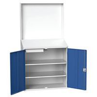 - Pracovní stanice s šikmým pultem a zadním panelem.