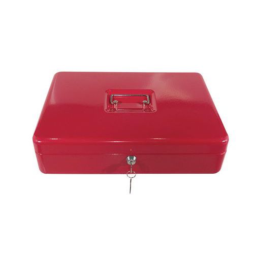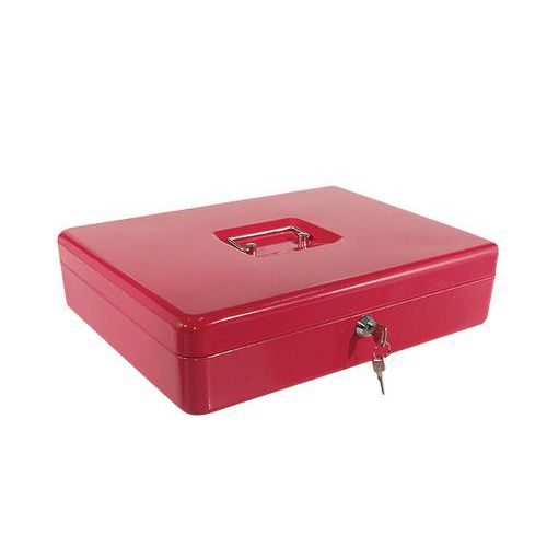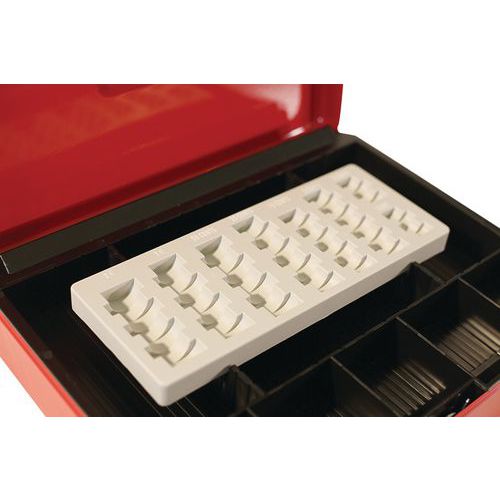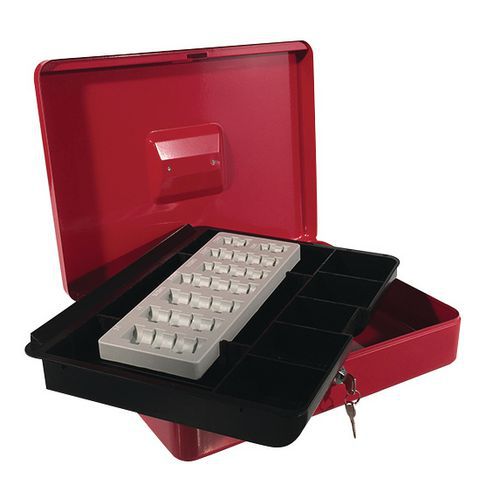 Příruční kovové pokladny v různých barevných variantách s horním úchytem. Obsahují vyjímatelný dělič se třemi přihrádkami a euromincovník (1, 2 eura, 1, 2, 5, 10, 20 a 50 centů).
