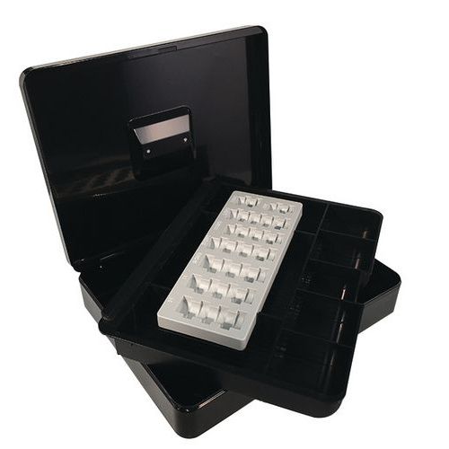 Příruční kovové pokladny v různých barevných variantách s horním úchytem. Obsahují vyjímatelný dělič se třemi přihrádkami a euromincovník (1, 2 eura, 1, 2, 5, 10, 20 a 50 centů).