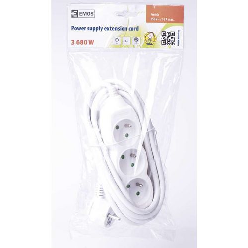 - Prodlužovací přívod, 3 zásuvka s délkou 1,2 m a průřezem vodiče 1 mm2. Vhodný pro maximální zátěž 10 A max.
