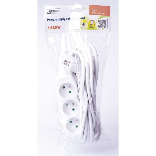 - Prodlužovací přívod, 3 zásuvka s délkou 1,2 m a průřezem vodiče 1 mm2. Vhodný pro maximální zátěž 10 A max.