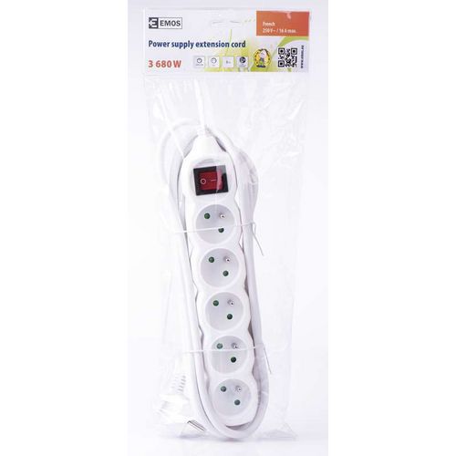 - Pprodlužovací přívod, 5 zásuvka s vypínačem, délkou až 10m a průřezem vodiče 1 mm2. Vhodný pro maximální zátěž 16 A max.